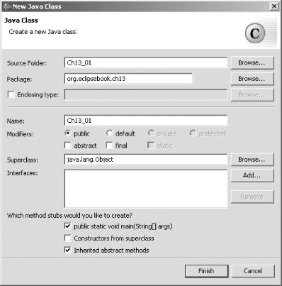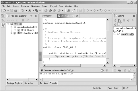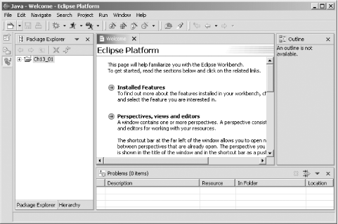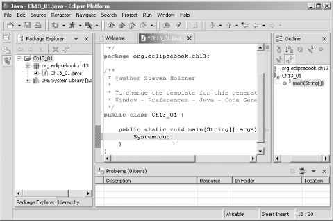 Eclipse 3.0 will ask if you want to switch to the Java perspective; click OK. The new Java perspective looks much like what we've seen before, except that the Tasks view has now been renamed the Problems view, as you see in Screenshot-4. Screenshot-4. The Eclipse 3.0 Java perspective